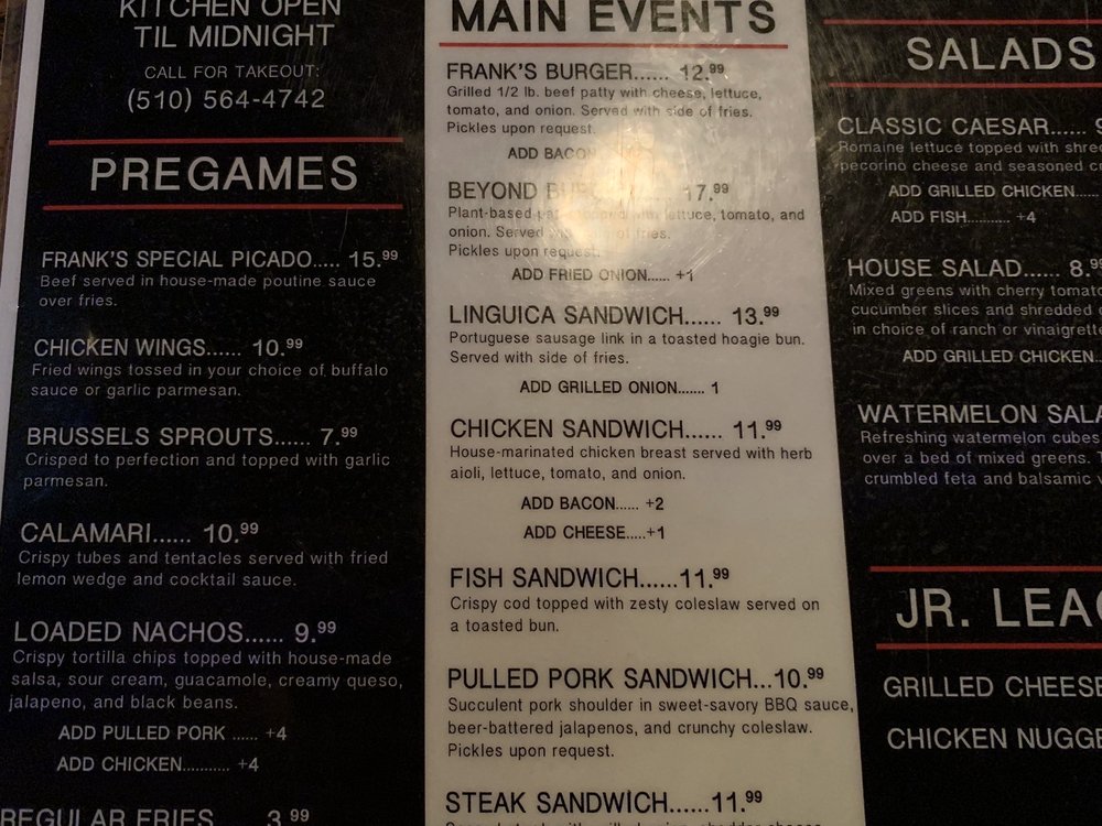 Welcome to Frank's Sports Bar & Grill, where casual dining meets lively sports bar vibes. Located at 2014 Marina Blvd, San Leandro, CA, this standout establishment combines American favorites with a touch of Mexican flair, making it an exciting dining experience.
